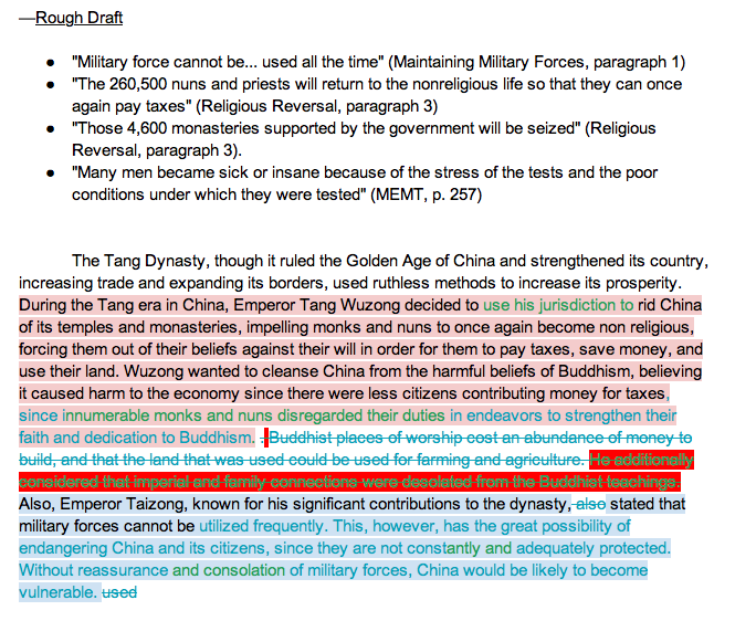 So I gave them three primary sources.  I told them that as a group (self-selected) that they had to choose which Big Idea they wanted to prove:  “The Tang dynasty used (ruthless/ingenious) methods to strengthen China’s government, expand its borders, and increase its economy.”  I pushed the assignment out through Google Classroom.  Then the students decided who was going to be the owner of the document and from there he/she shared the document with their peers.